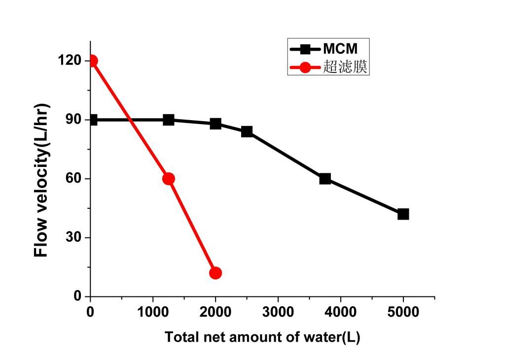 对比试验表明,超滤膜在总净水量为2000L时,当前流量从初始的120L/hr,降低到不足12L/hr,流量衰变极大的原因,在于超滤膜的截留分子量比PP片小很多,同时,活性炭不具有降解有机物和胶体功能,无法达到自清洁,与此同时,活性炭吸附的
