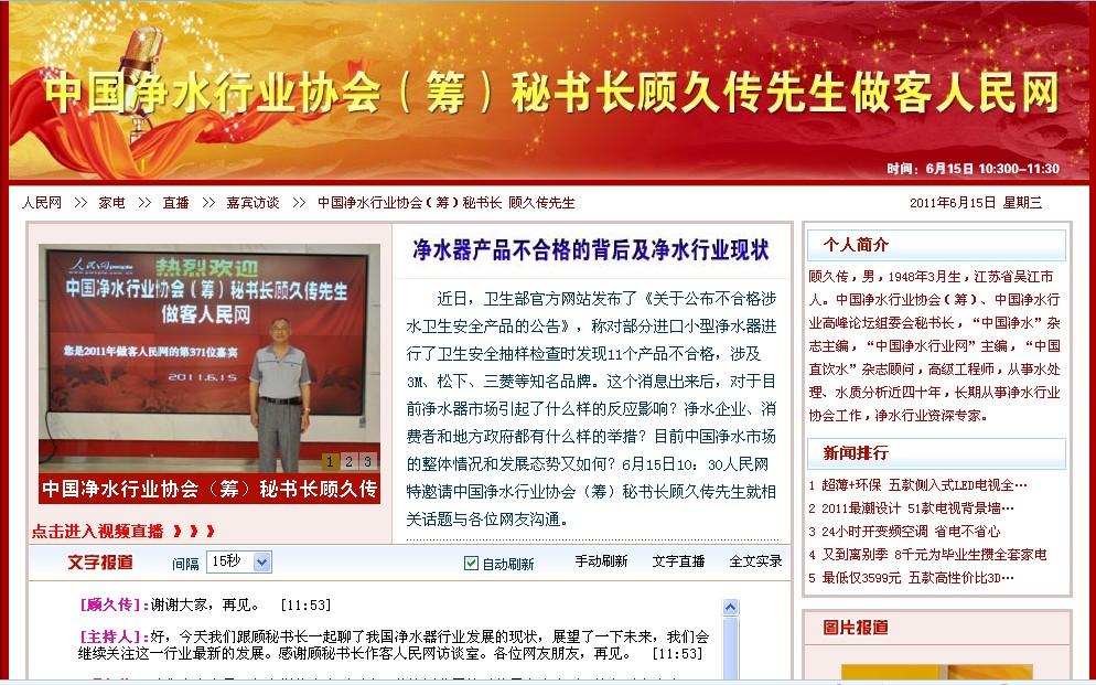 近日,卫生部官方网站发布了《关于公布不合格涉水卫生安全产品的公告》,称对部分进口小型净水器进行了卫生安全抽样检查时发现11个产品不合格,涉及3M、松下、三菱等知名品牌。这个消息出来后,对于目前净水器市场引起了什么样的反应影响?净水企业、消费者和地方政府都有什么样的举措?目前中国净水市场的整体情况和发展态势又如何?6月15日10:30人民网特邀请中国净水行业协会(筹)秘书长顾久传先生就相关话题与各位网友沟通。